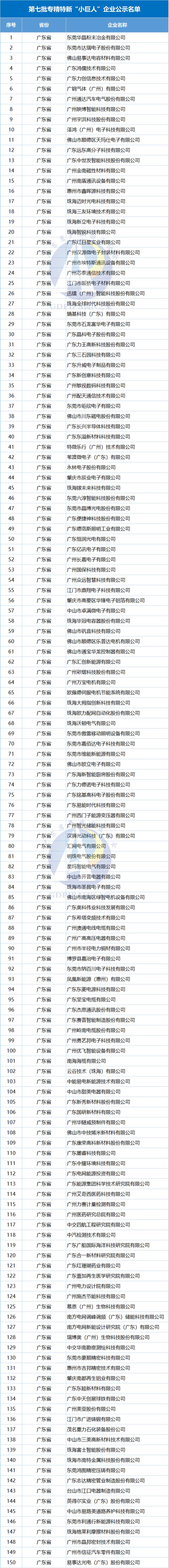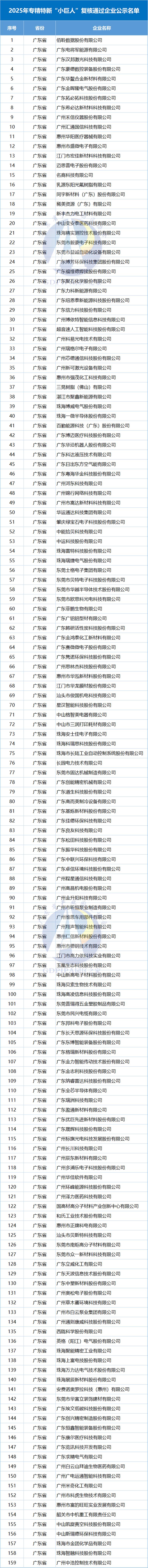 据广东省工业和信息化厅公示的《第七批专精特新“小巨人”企业和2025年专精特新“小巨人”复核通过企业名单》,本批拟新增企业344家,通过复核159家。